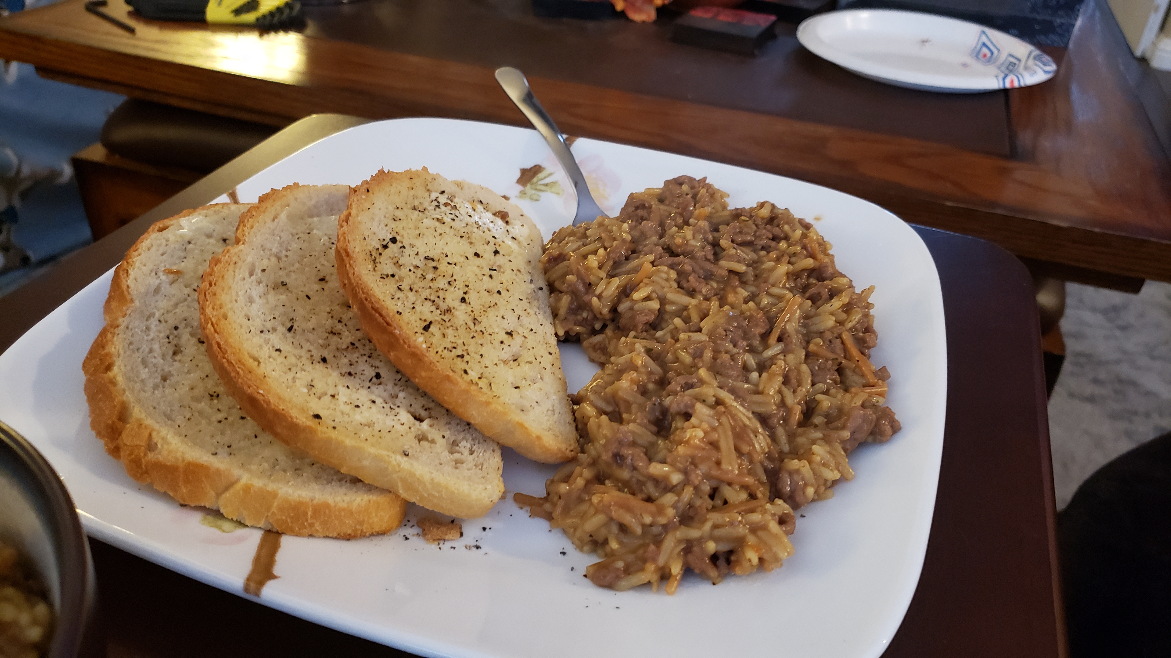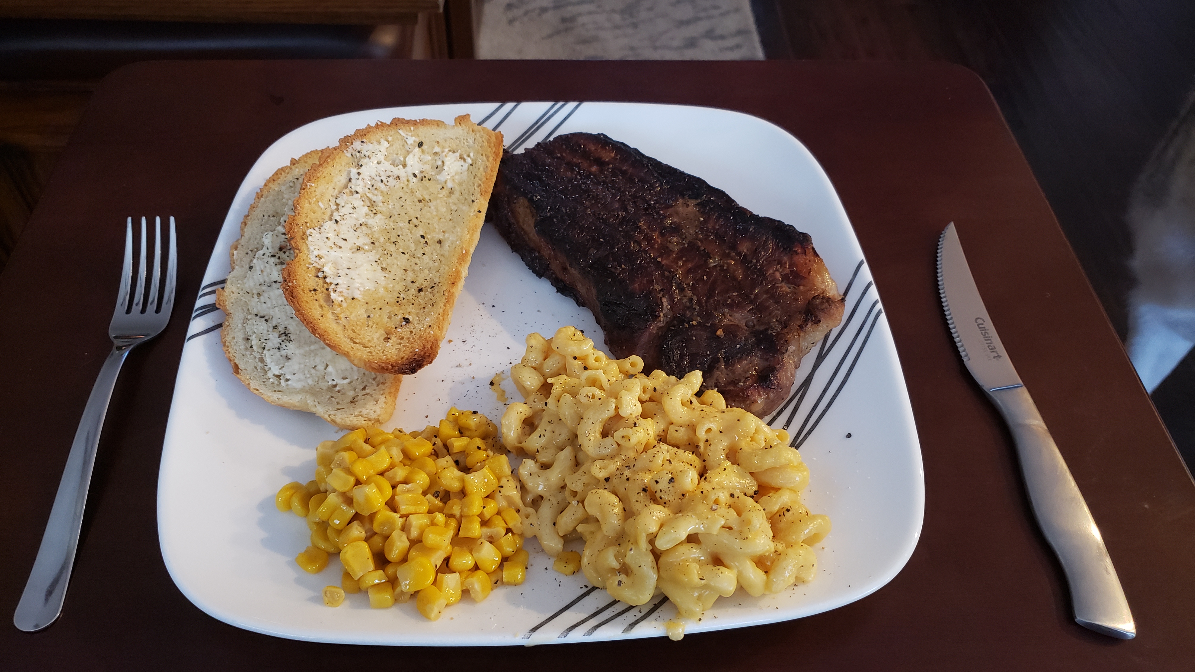 Steak, Mac n Cheese, Corn, Sourdough toast